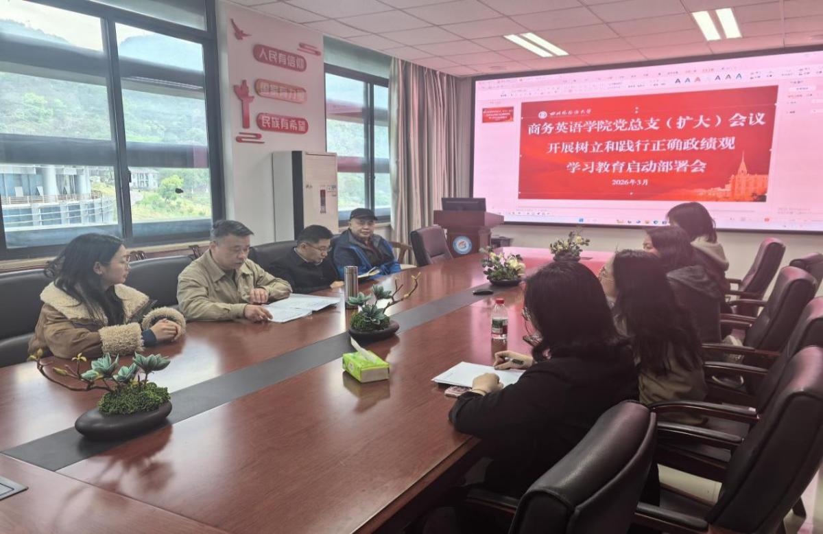 2026年3月20日下午,商务英语学院在立德楼B602召开党总支(扩大)会议,启动部署树立和践行正确政绩观学习教育。党总支书记苏雪主持会议并作动员部署,全体党总支委员、党支部书记参加了会议。