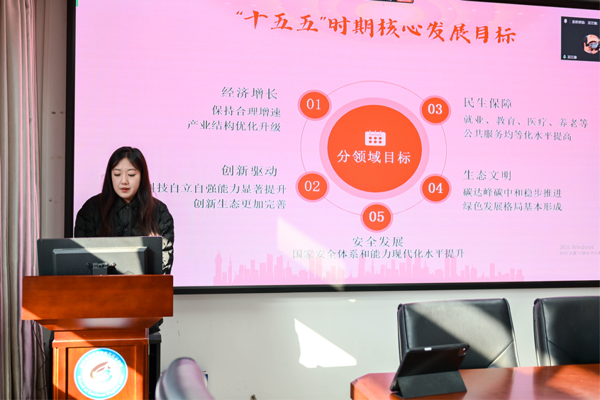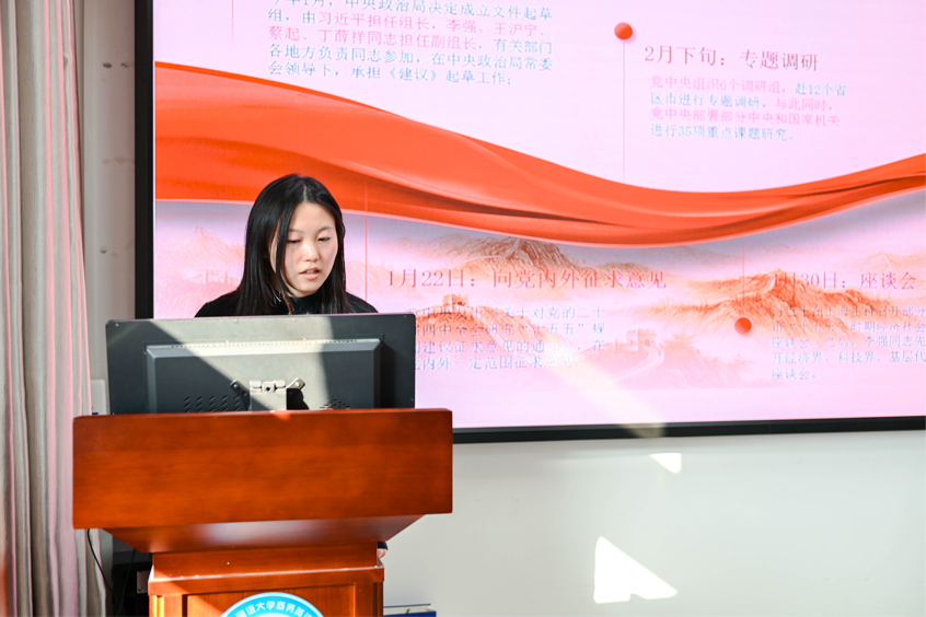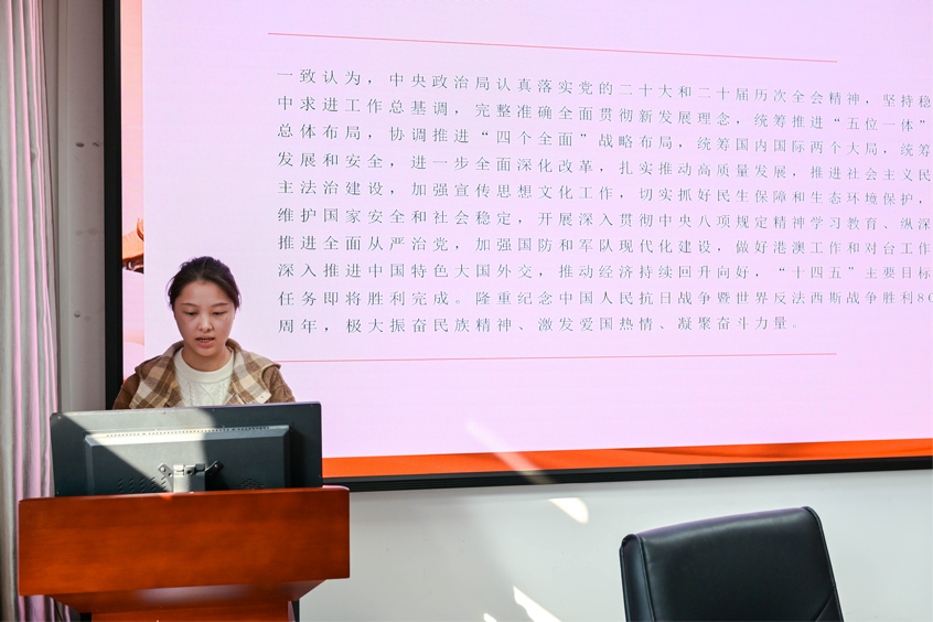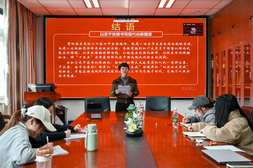 (四)小组讨论,思想碰撞 领学结束后,支部开展集体讨论与心得分享。谢在山表示,通过系统学习党的二十届四中全会精神及“十五五”规划建议,深刻认识到青年一代在国家发展中的重要使命,作为商务英语专业党员,将深耕专业知识,提升跨文化沟通能力,为扩大高水平对外开放贡献力量。吴娅妮结合党外人士座谈会精神与个人成长谈到,国家规划的制定注重集思广益、科学谋划,这启示自己在学习生活中要树立长远视野,提前预判应对困难,将个人目标与国家发展同频共振。胡环表示,通过学习习近平关于“十五五”规划建议的说明,深刻体会到规划制定的严谨性与前瞻性,将把这种系统思维运用到专业学习中,强化落地执行,切实提升自身能力本领。孙浩珈强调,“十五五”规划对对外开放、新质生产力发展的部署与商务英语专业紧密相关,未来将主动对接国家需求,在跨境经贸合作、国际交流等领域积极实践,以专业所长服务国家发展。