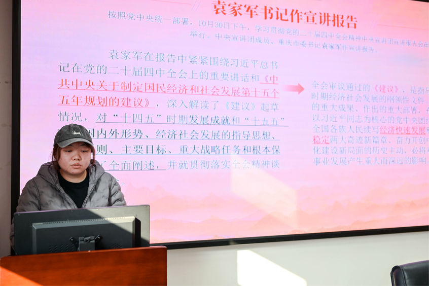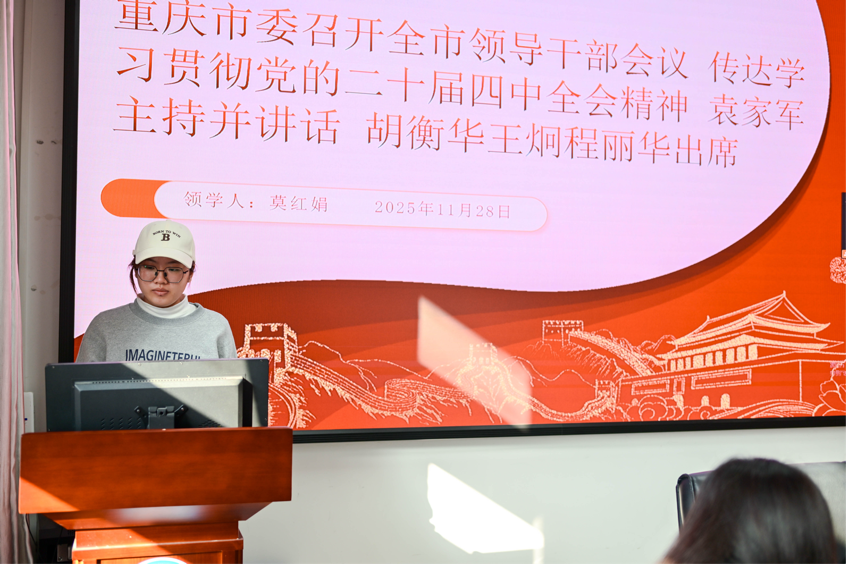 依次,谢谨诗同志带领大家学习贯彻党的二十届四中全会精神中央宣讲团宣讲报告会精神,详细传达了中央宣讲团成员、重庆市委书记袁家军所作宣讲报告的核心内容,系统梳理了“十四五”时期的重大成就、“十五五”时期的国内外形势、指导思想、重大原则、主要目标和十二项战略任务,重点解读了党的领导与建设的重要部署,以及“十五五”时期与重庆建设的紧密联系,强调要立足重庆实际推动全会精神落地见效。