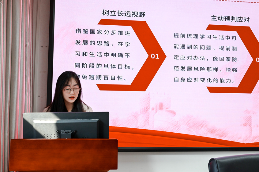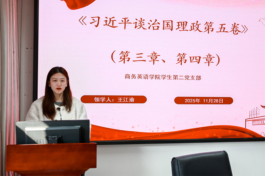 紧接着,王江渝同志聚焦《习近平谈治国理政》第五卷第三章、第四章内容,深入阐释“扩大高水平对外开放是中国式现代化的鲜明标识”这一核心要义,详细解读了建设更高水平开放型经济新体制、打造对外开放新高地等关键部署,结合海南自由贸易港、跨境电商新业态等实践案例具象化分析;随后围绕“因地制宜发展新质生产力”展开讲解,从产业、区域、工作三个层面分享实践方向,强调要将新质生产力理念融入专业学习与日常工作,打造“语言+专业+创新”的核心竞争力。