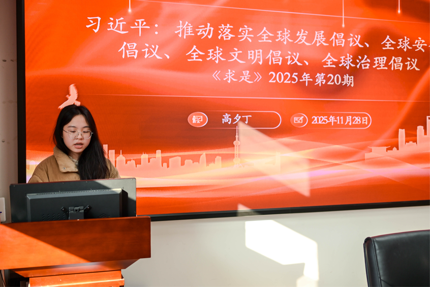(三)专题学习:习近平外交思想 最后,高夕丁同志领学习近平《推动落实全球发展倡议、全球安全倡议、全球文明倡议、全球治理倡议》一文,详细解读了四大倡议的核心内涵与实践要求,阐释了中国在全球治理体系变革中坚持主权平等、国际法治、多边主义等原则的坚定立场,介绍了中国为世界经济复苏、人类命运共同体构建贡献的智慧与方案,引导党员树立家国情怀与国际视野,理解中国特色大国外交的责任与担当。