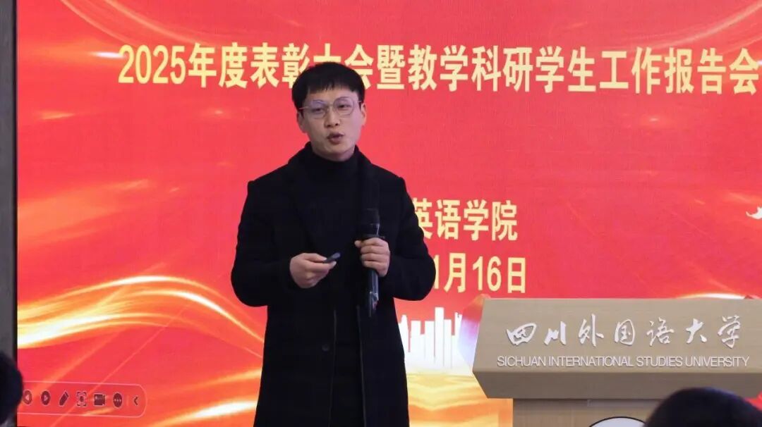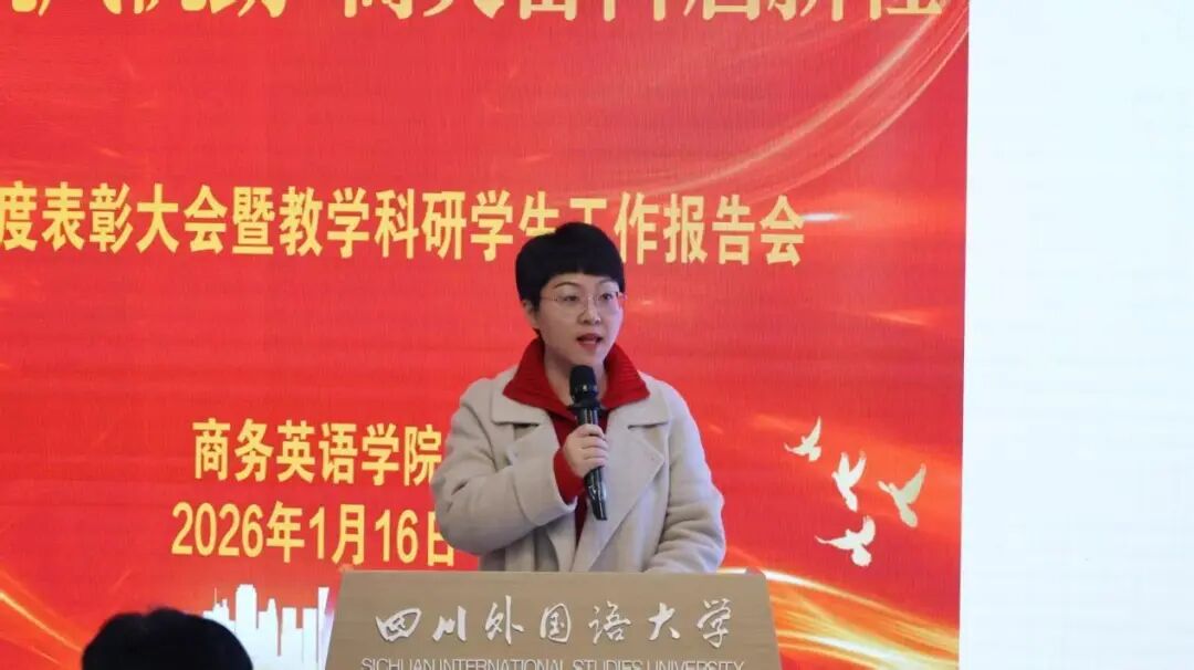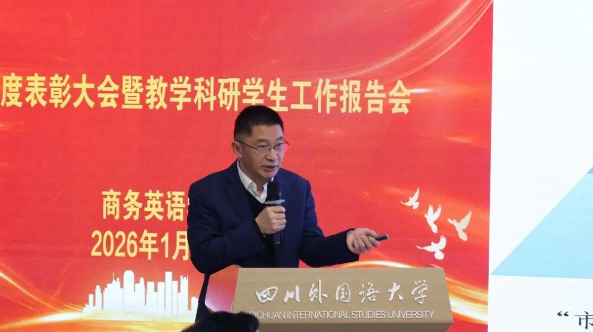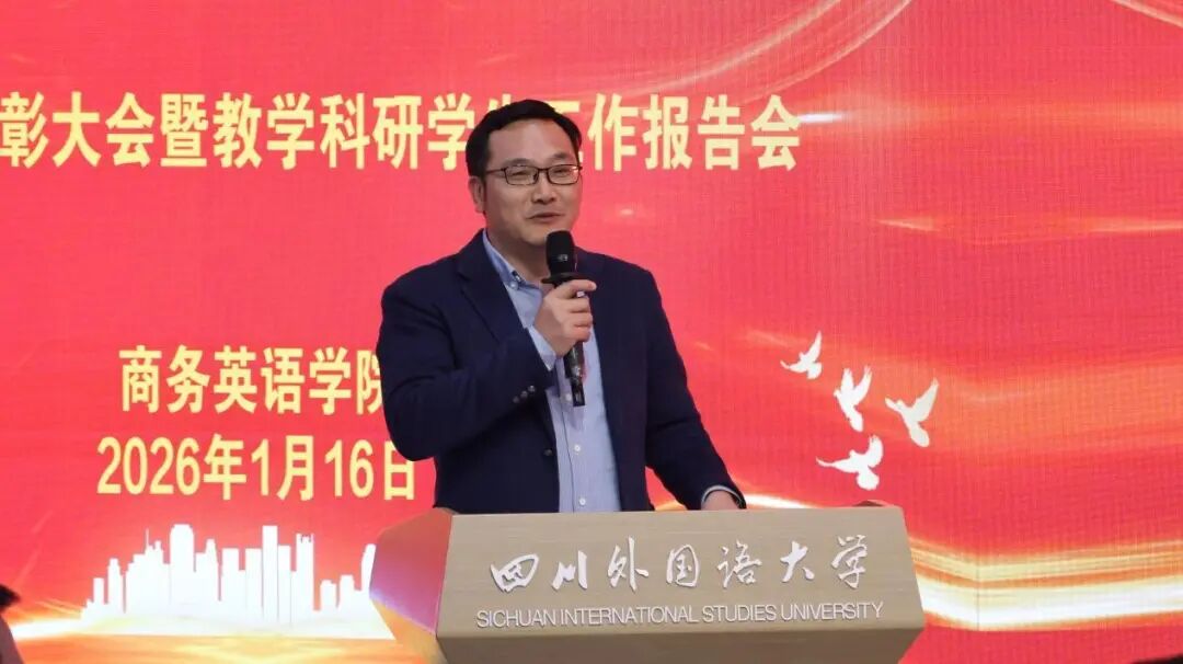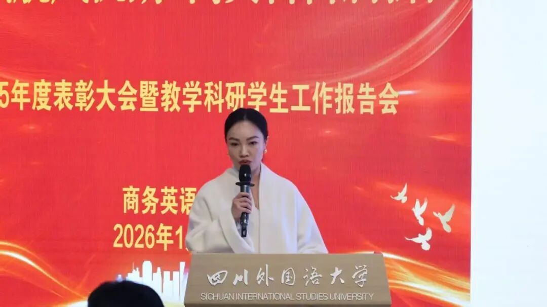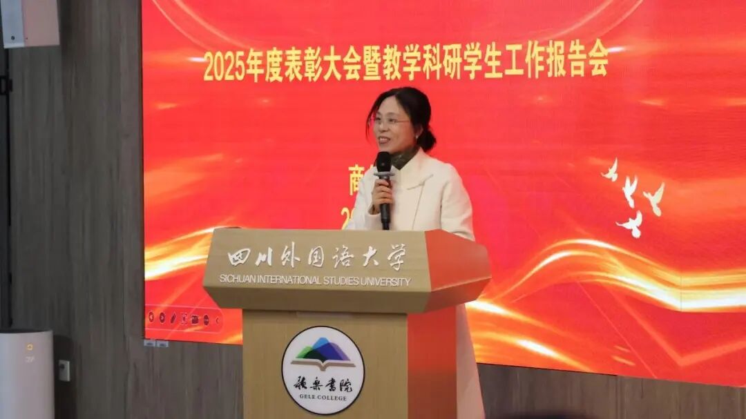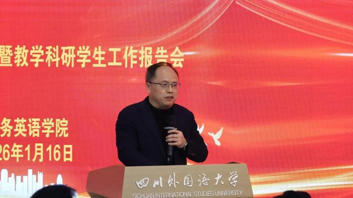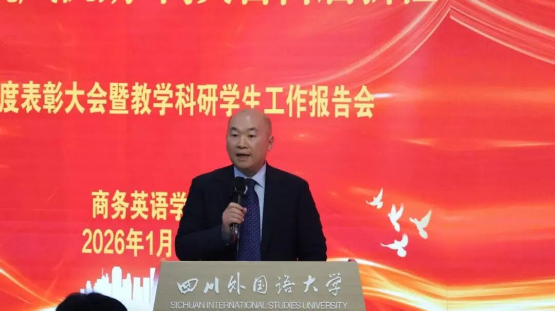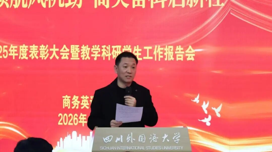2026年1月16日下午,商务英语学院2025年度表彰大会暨教学科研学生工作报告会在歌乐书院顺利召开。四川外国语大学校长董洪川、副校长王仁强、副校长严功军、教务处处长刘玉梅、科研处处长林移刚、人事处处长檀春耕、党委学生工作部部长常慧明、招生就业处处长申安桂、党委教师工作部部长陈惠、研究生院副院长龙丹、商务英语学院党总支书记苏雪、院长胡文飞、党总支副书记曾静、副院长顾金成、副院长董曼霞及商务英语学院全体教职工出席了此次活动。大会由商务英语学院副院长董曼霞主持。