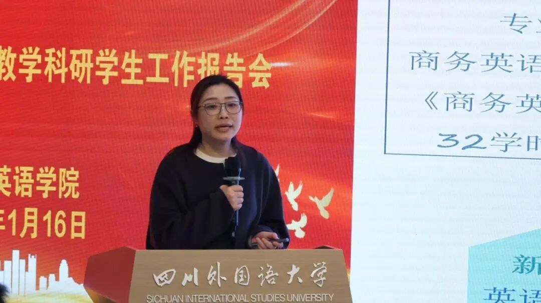 在表彰环节,大会对2025年度表现突出的团队和个人进行了表彰。现场颁奖嘉宾为市级及以上称号与荣誉、教师个人及团队参赛获市级及以上奖励、国家级市级课程与项目、指导学生获市级及以上奖励、科研先锋奖、特殊贡献奖进行颁奖。学院向所有获奖教师和颁奖嘉宾表示感谢,并期待全体教师继续以党建为引领,奋楫前行,共同书写商务英语教育新篇章! 教学科研学生工作报告会 01 周俐老师谈课程建设 刘玉梅处长点评