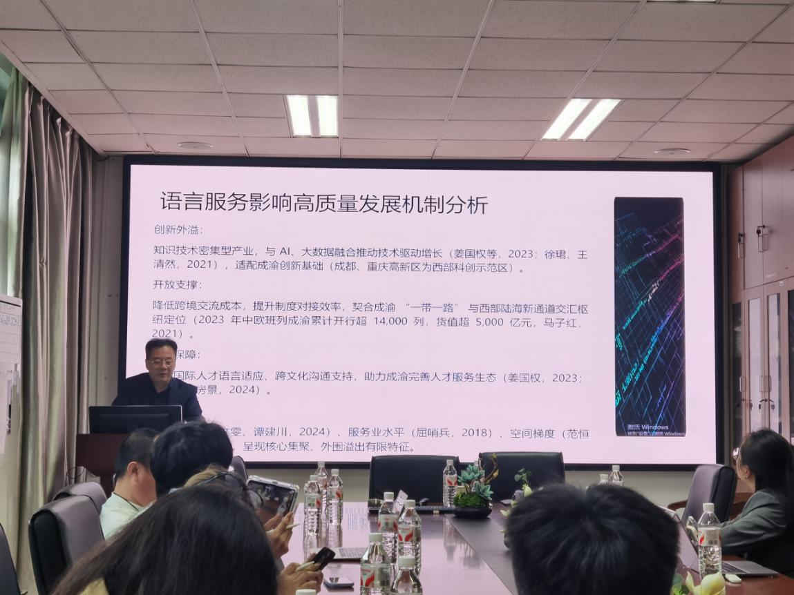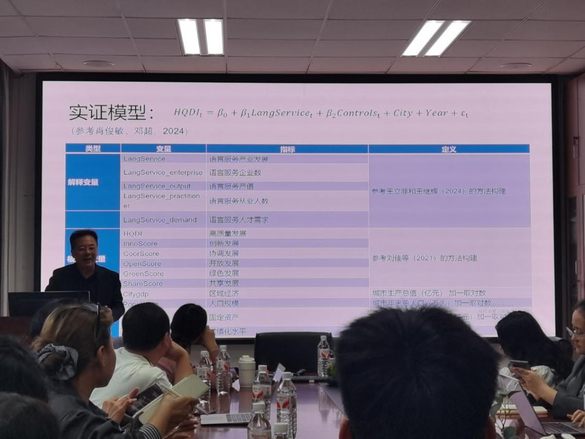 下午的座谈会由刘萍博士主持,王立非教授转向产业经济视角,基于2005–2022年川渝地区19个城市的面板数据,运用双向固定效应模型,实证检验语言服务产业对区域高质量发展的影响。研究发现,语言服务产业对川渝经济高质量发展具有显著促进作用(系数0.554,p<0.01),尤其在开放、创新、共享与协调四个维度表现突出,但也存在绿色发展不足、区域间“核心极化–边缘塌陷”等结构性问题。