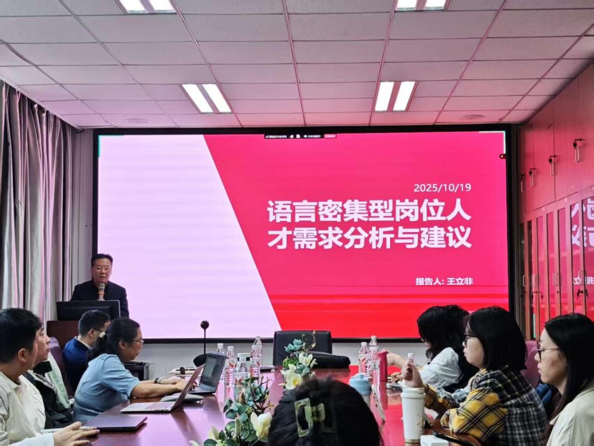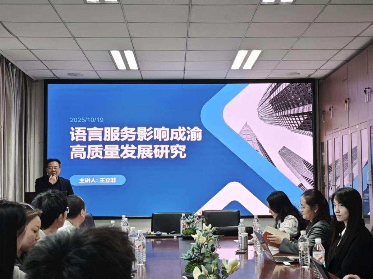 2025年10月19日,四川外国语大学商务英语学院连续举办两场语言服务专题座谈会,特邀四川外国语大学“巴渝学者”、北京语言大学高级翻译学院教授王立非出席主讲。两场座谈会分别围绕“语言服务人才战略资源”与“语言服务产业对川渝经济高质量发展的影响”展开深入探讨,吸引了校内外师生共80余人次参与。