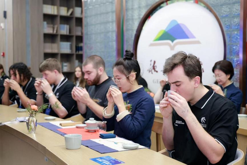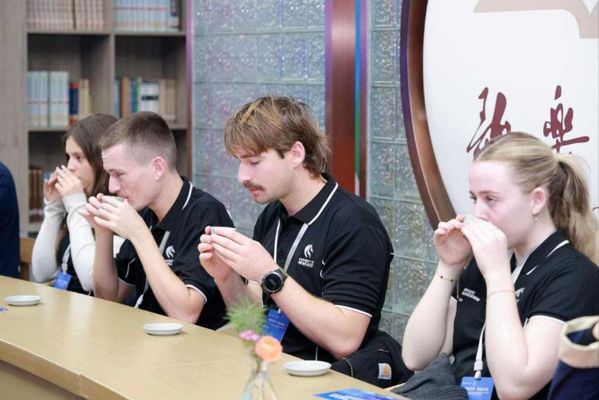 随后,活动进入第二环节——沉浸式茶道体验。茶道师先引导外国师生放松身心、调整呼吸,随后现场演示并手把手指导大家依次完成温具、置茶、冲泡、奉茶等茶艺步骤,让参与的师生们在实操中感知茶香与器物的独特意韵,切实体会中华茶文化 “和静怡真” 的核心内涵,为跨文化交流增添了深邃而温润的意蕴。