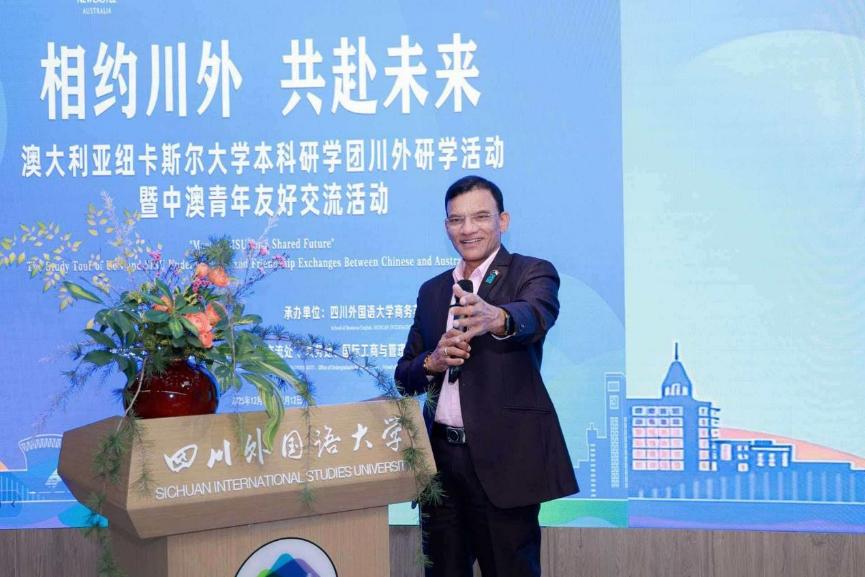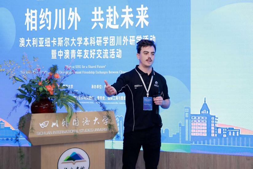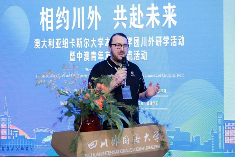 (活动全体成员留影) 活动伊始,四川外国语大学国际交流与合作处处长朱天祥先生致欢迎辞,向远道而来的澳大利亚纽卡斯尔大学师生表示热烈欢迎。他在致辞中表示,此次交流旨在向各位展示这座充满机遇的城市所蕴含的巨大潜力,双方的合作也将创造长远价值。朱天祥处长强调,真正的友谊可以跨越山海,并期待此次研学活动能为两校未来的深度合作奠定坚实基础。随后纽卡斯尔大学学术理事会主席Marcus Rodrigs以及两位学生代表相继发言,多方传递出共同的心声:以研学互鉴为桥,织就中澳青年的共同记忆,共谱未来合作的青春交响。