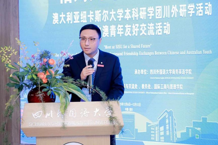 2025年12月7日上午,“相遇川外·共赴未来”澳大利亚纽卡斯尔大学本科研学团川外研学活动暨中澳青年友好交流活动欢迎会于四川外国语大学歌乐书院举行。澳大利亚纽卡斯尔大学学术理事会主席Marcus Rodrigs、教师Yasmin Librizzi、四川外国语大学国际合作与交流处处长朱天祥、教务处副处长张庆,商务英语学院副院长顾金成、中澳项目负责人杨前辉、中澳项目办公室主任余静、2025级辅导员金晶以及纽卡斯尔大学近30名本科生和中澳项目近40名本科生共同参与。欢迎会由学生王雯宜、洪双翎、曾绎暄共同主持。