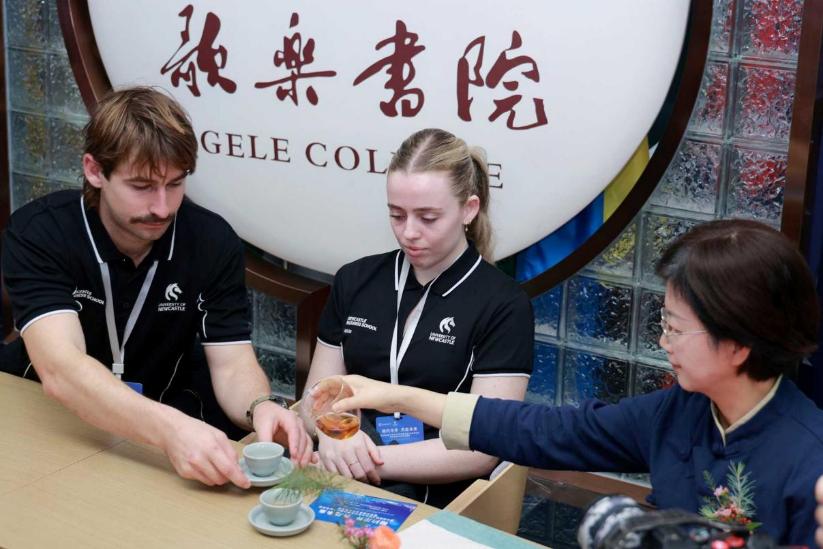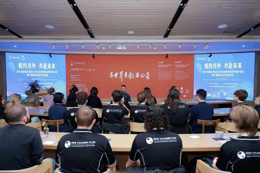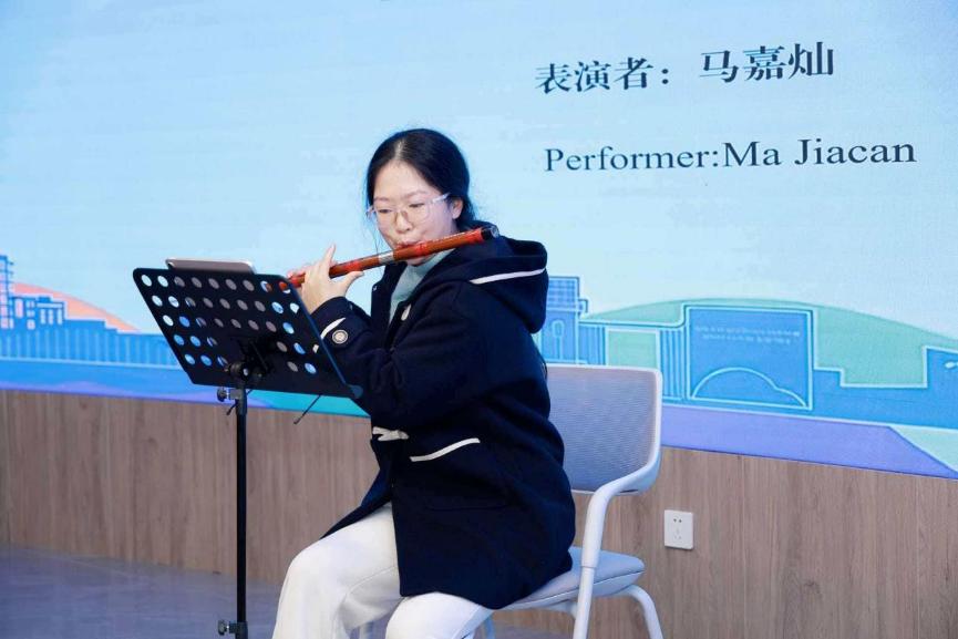 (茶道体验环节留影) 第三环节为传统乐器表演。长笛独奏《光亮》以清澈悠扬的旋律,传递出静谧中蕴藏希望的独特意境;古筝与二胡合奏的《青花瓷》,则将传统乐器的典雅与现代曲风相融合,细腻婉转的乐声打动了在场师生。整场表演不仅展现了中国传统乐器的独特韵味与艺术风采,更以音乐为纽带,为中澳师生搭建起文化共情的艺术桥梁。