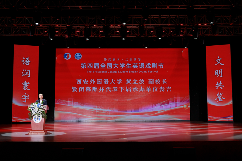 活动最后,西安外国语大学副校长黄立波致闭幕词,并代表下届承办单位发言。他表示,能够承办下一届全国大学生英语戏剧节深感荣幸。他高度评价本届戏剧节组织精心、成果丰硕,在感谢四川外国语大学悉心筹备的同时,也向所有参赛高校团队的精彩呈现致以谢意。他表示,西安外国语大学将全力以赴做好下届戏剧节各项筹备工作,为全国高校师生搭建更为广阔的戏剧与语言艺术交流平台。